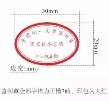 新启用的发票监制章形状为椭圆型,长轴为3厘米,短轴为2厘米,边宽为0.1厘米,内环加刻一细线,上环刻制“全国统一发票监制章”字样,中间刻制“国家税务总局”字样,下环刻制“××省(区、市)税务局”字样,下环字样例如:“上海市税务局”。字体为楷体7磅,印色为大红色。